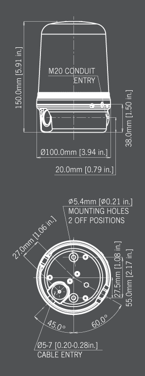 | Entries: | 1 × 5-7mm push through grommet 1 x M20 cable entry |