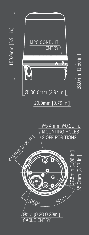 | Entries: | 1 × 5-7mm push through grommet 1 x M20 cable entry |
