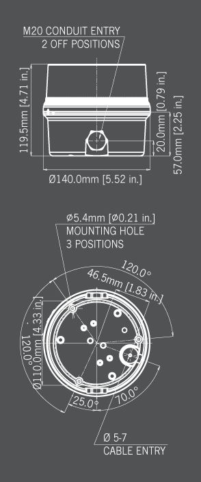 | Entries: | 1 × 5-7mm push through grommet 2 x M20 cable entry |